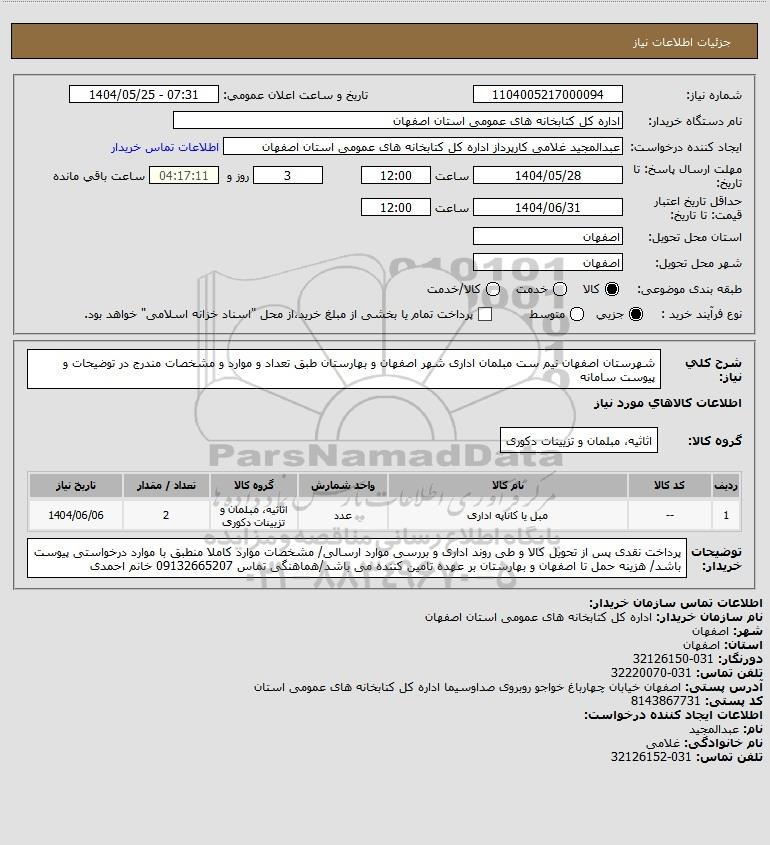 شرح کلی نیاز: شهرستان اصفهان نیم ست مبلمان اداری شهر اصفهان و بهارستان طبق تعداد و موارد و مشخصات مندرج در توضیحات و پیوست سامانه