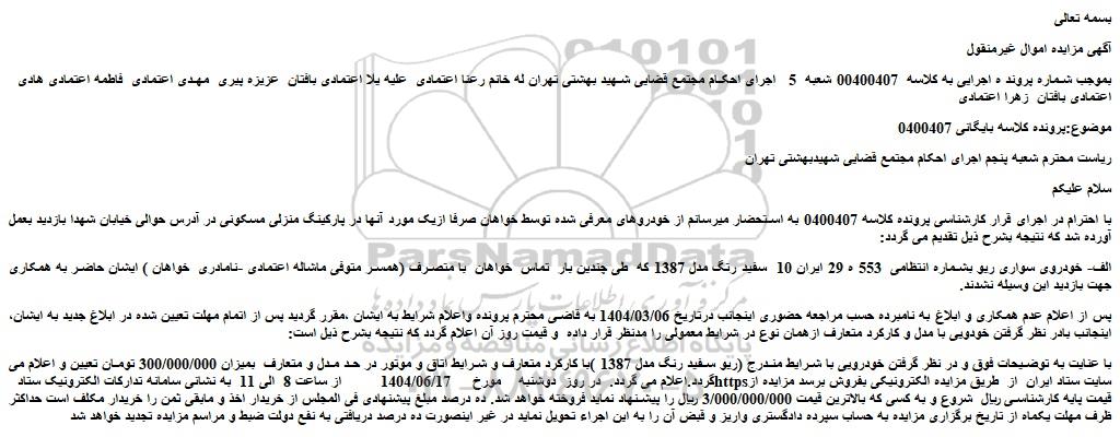 با عنایت به توضیحات فوق و در نظر گرفتن خودرویی با شرایط مندرج (ریو سفید رنگ مدل 1387 )با کارکرد متعارف و شرایط اتاق و موتور در حد مدل و متعارف بمیزان 300/000/000 تومان تعیین و اعلام می گردد.اعلام می گردد. در روز دوشنبه مورخ 1404/06/17 از ساعت 8 الی 11 به نشانی سامانه تدارکات الکترونیک ستاد سایت ستاد ایران از طریق مزایده الکترونیکی بفروش برسد مزایده از قیمت پایه کارشناسی ریال شروع و به کسی که بالاترین قیمت 3/000/000/000 ریال را پیشنهاد نماید فروخته خواهد شد. ده درصد مبلغ پیشنهادی فی المجلس از خریدار اخذ و مابقی ثمن را خریدار مکلف است حداکثر ظرف مهلت یکماه از تاریخ برگزاری مزایده به حساب سپرده دادگستری واریز و قبض آن را به این اجراء تحویل نماید در غیر اینصورت ده درصد دریافتی به نفع دولت ضبط و مراسم مزایده تجدید خواهد شد