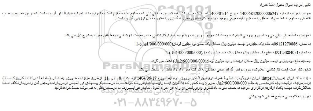 بنابراین مقررگردید خطوط همراه فوق فوق الذکر درروز  دوشنبه  مورخ 1404/06/17 ازساعت  8  الی  11  ازطریق مزایده حضوری  به نشانی (سامانه تدارکات الکترونیک ستاد)سایت ستاد ایران  بفروش برسد.مزایده ازقیمت پایه کارشناسی به مبلغ 2/900/000/000ریال شروع وبه کسی که بالاترین قیمت راپیشنهادنمایدفروخته خواهدشد.ده درصدمبلغ پیشنهادی فی المجلس ازخریداراخذومابقی ثمن راخریدارمکلف است حداکثرظرف مهلت یکماه ازتاریخ برگزاری مزایده به حساب سپرده دادگستری واریزوقبض آن رابه این اجراء تحوبل نمایددرغیراینصورت ده درصددریافتی به نفع دولت ضبط خواهدگردید.