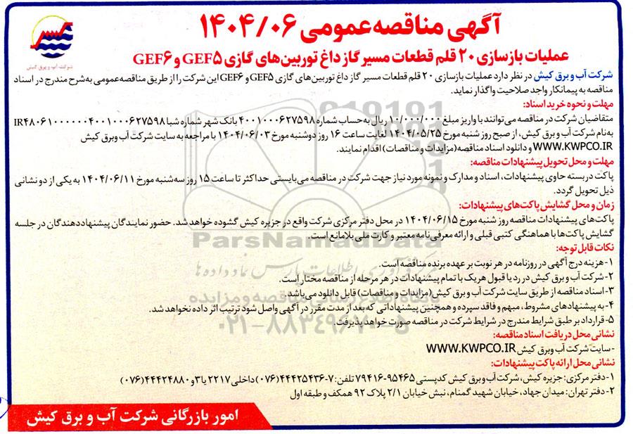 شرکت آب و برق کیش در نظر دارد عملیات بازسازی 20 قلم قطعات مسیر گاز داغ توربین های گازی GEF5 و GEF6  این شرکت را از طریق مناقصه عمومی بشرح مندرج در اسناد مناقصه از شرکت واجد شرایط خریداری نماید