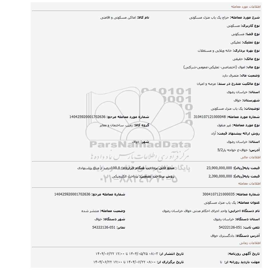 | شماره مورد معامله: 3104107121000048 | شماره مورد معامله مرجع: 140425920001702636 | |
