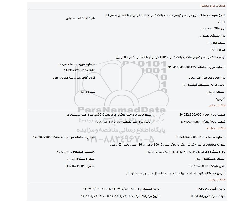 شرح مورد معامله: حراج مزایده و فروش ملک به پلاک ثبتی 10042 فرعی از 86 اصلی بخش 03 اردبیل | نام کالا: خانه مسکونی | |