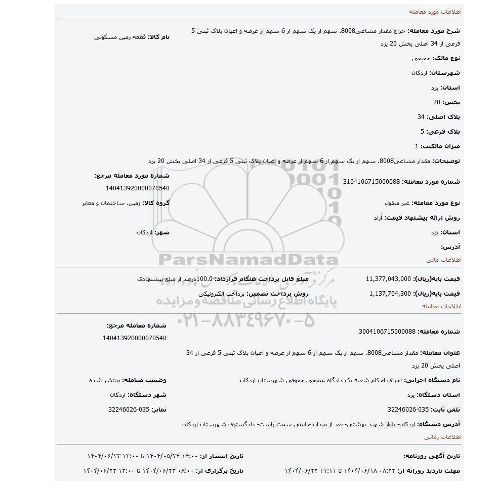| عنوان معامله: مقدار مشاعی8008. سهم از یک سهم از 6 سهم از عرصه و اعیان پلاک ثبتی 5 فرعی از 34 اصلی یخش 20 یزد | ||
