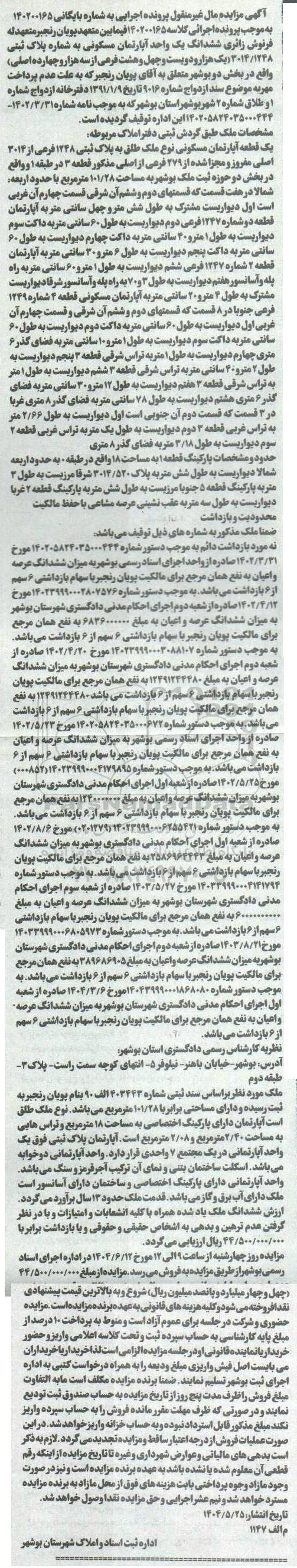 مزایده فروش یک قطعه آپارتمان مسکونی با مساحت 101.28 مترمربع با پلاک ثبتی 1248 فرعی از 3014 اصلی