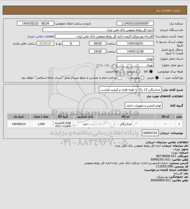 شرح کلی نیاز: مدادرنگی 12 رنگ با جعبه فلزی و کیفیت مناسب