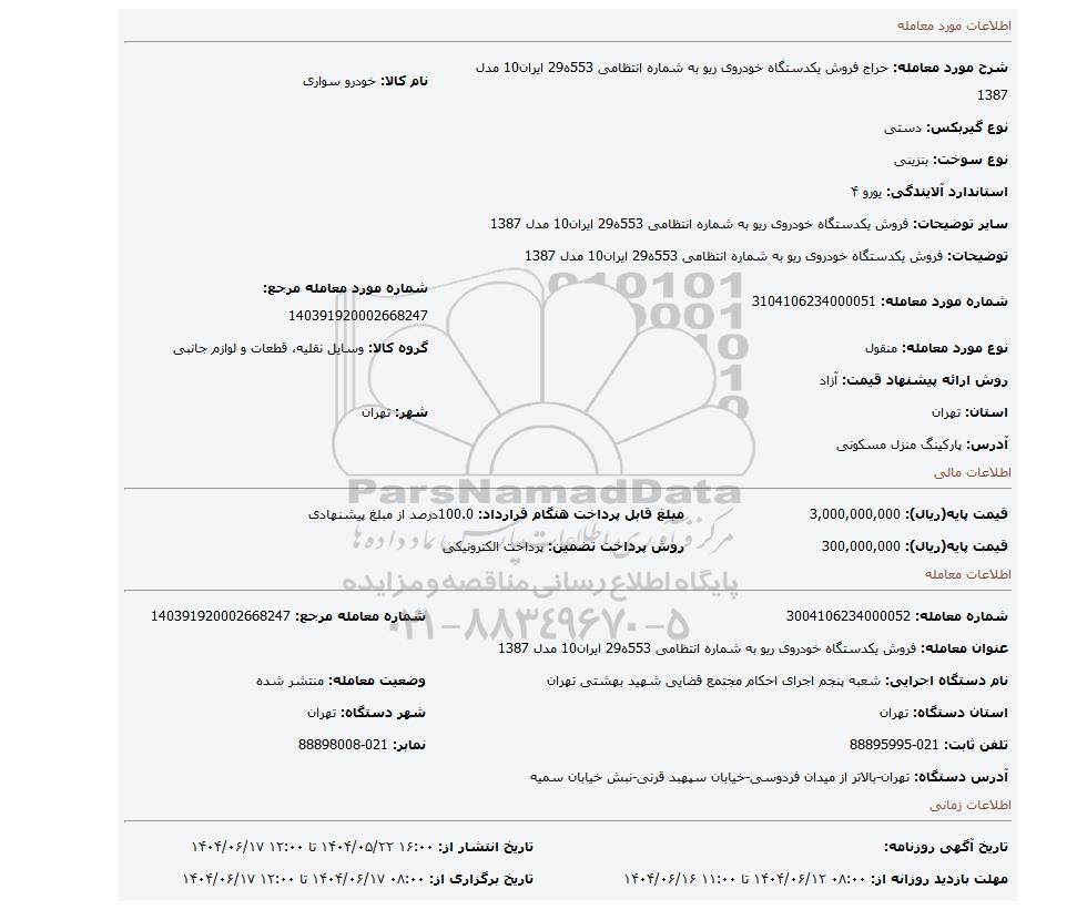 قیمت پایه(ریال): 300,000,000روش پرداخت تضمین: پرداخت الکترونیکی