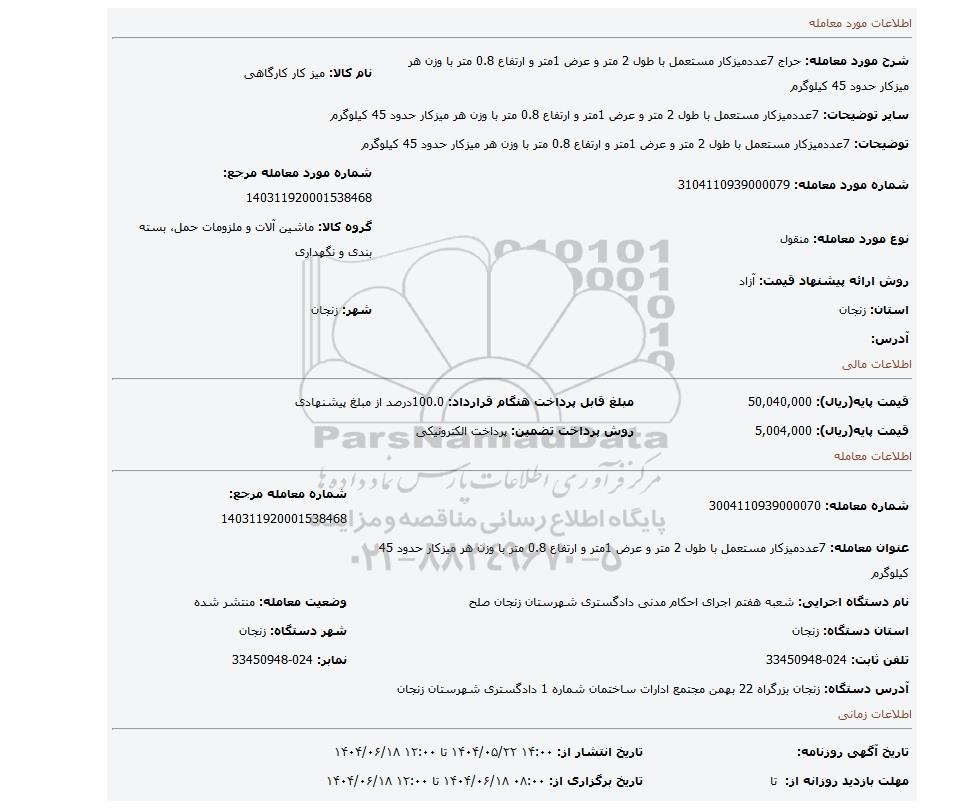 | شماره مورد معامله: 3104110939000079 | شماره مورد معامله مرجع: 140311920001538468 | |