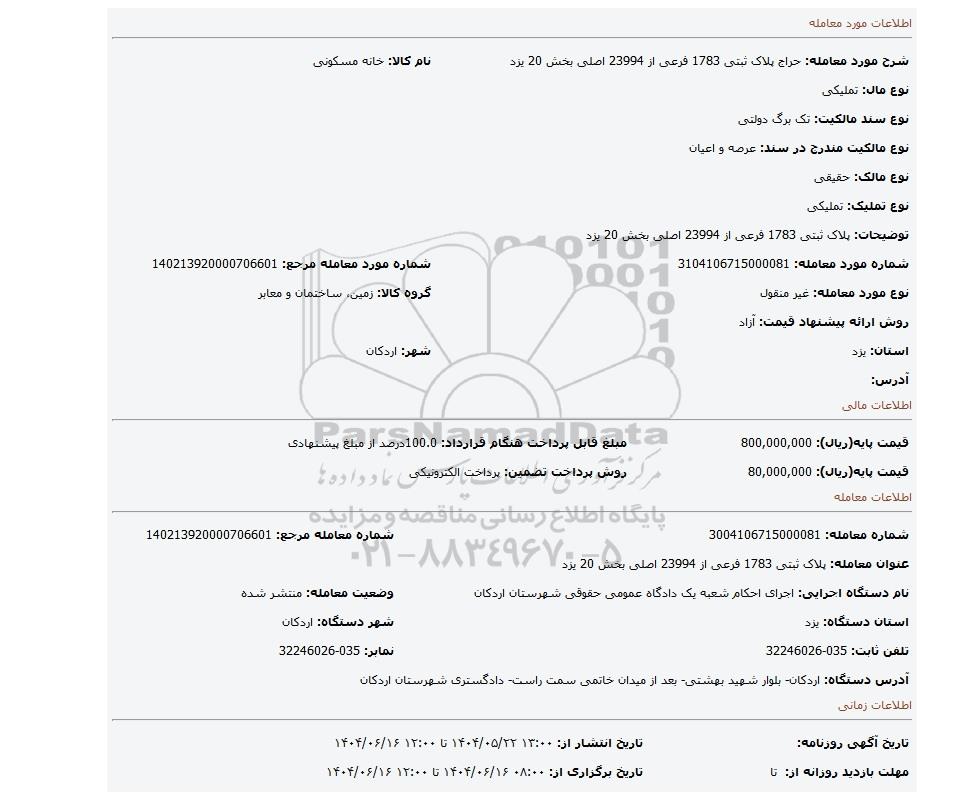 مزایده پلاک ثبتی 1783 فرعی از 23994 اصلی بخش 20 یزد, مزایده، پلاک ثبتی 1783 فرعی از 23994 اصلی بخش 20 یزد
