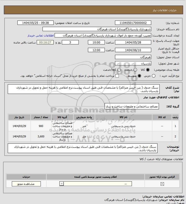 شرح کلی نیاز: سنگ جدول ( بتن خیس متراکم) با مشخصات فنی طبق اسناد پیوست.نرخ اعلامی با هرینه حمل و تحویل در شهرداری پارسیان باشد.