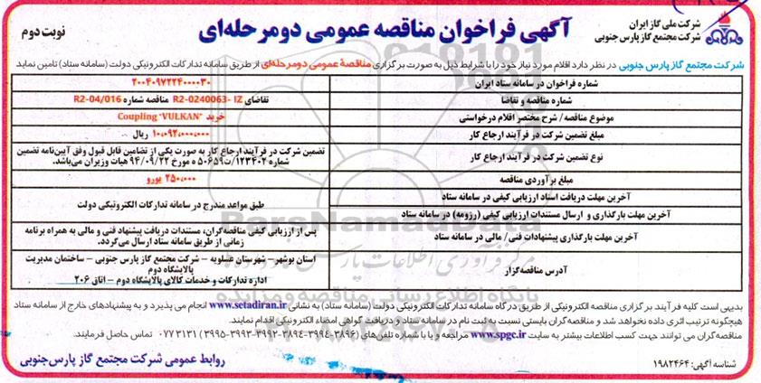 مناقصه خرید Coupling VULKAN - نوبت دوم, مناقصه خرید Coupling VULKAN - نوبت دوم