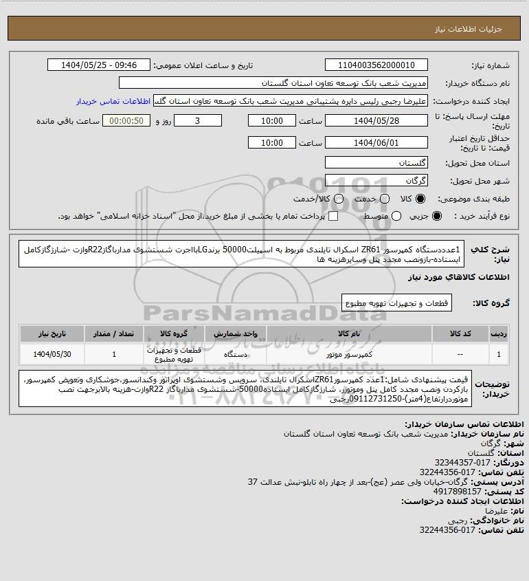 شرح کلی نیاز: 1عدددستگاه کمپرسور ZR61 اسکرال تایلندی مربوط به اسپیلت50000 برندLGبااجرت شستشوی مدارباگازR22وازت -شارژگازکامل ایستاده-بازونصب مجدد پنل وسایرهزینه ها
