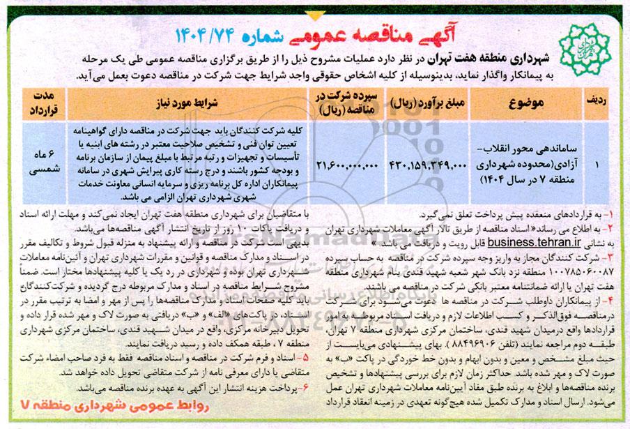 شهرداری منطقه هفت تهران در نظر دارد عملیات مشروح ذیل را از طریق برگزاری مناقصه عمومی طی یک مرحله به پیمانکار واگذار نماید، بدینوسیله از کلیه اشخاص حقوقی واجد شرایط جهت شرکت در مناقصه دعوت بعمل می آید.