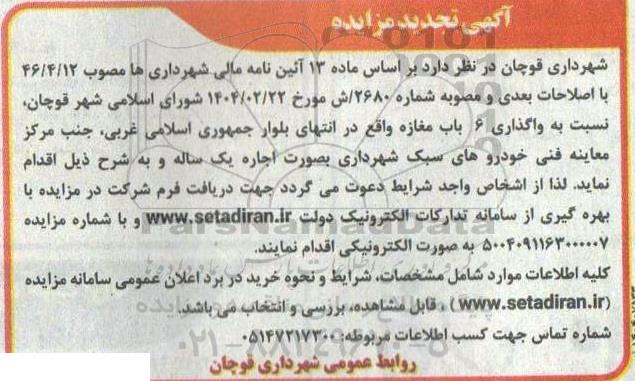 شهرداری قوچان در نظر دارد بر اساس ماده 13 آئین نامه مالی شهرداری ها مصوب 46.4.12 با اصلاحات بعدی و مصوبه شماره 2680/ ش مورخ 1404.02.22 شورای اسلامی شهر قوچان، نسبت به واگذاری 6 باب مغازه واقع در انتهای بلوار جمهوری اسلامی غربی، جنب مرکز معاینه فنی خودروهای سبک شهرداری بصورت اجاره یک ساله و به شرح ذیل اقدام نماید. لذا از اشخاص واجد شرایط دعوت می گردد جهت دریافت فرم شرکت در مزایده با بهره گیری از سامانه تدارکات الکترونیک دولت سایت ستاد ایران و با شماره مزایده 5004091163000007 به صورت الکترونیکی اقدام نمایند.