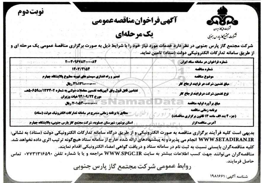 شرکت مجتمع گاز پارس جنوبی در نظر دارد خدمات مورد نیاز خود را با شرایط ذیل به صورت برگزاری مناقصه عمومی یک مرحله ای از طریق سامانه تدارکات الکترونیکی دولت سامانه ستاد تامین نماید.