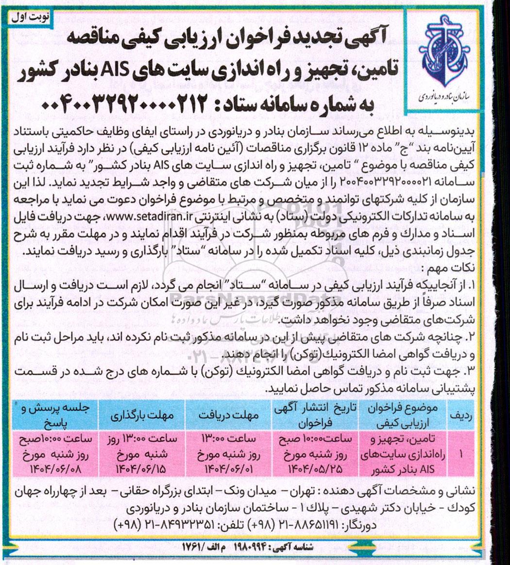 بدینوسیله به اطلاع میرساند سازمان بنادر و دریانوردی در راستای ایفای وظایف حاکمیتی باستناد آیین نامه بند «ج» ماده 12 قانون برگزاری مناقصات آئین نامه ارزیابی کیفی در نظر دارد فرآیند ارزیابی کیفی مناقصه با موضوع تامین تجهیز و راه اندازی سایت های AIS بنادر کشور به شماره ثبت سامانه 2004003292000021 را از میان شرکتهای متقاضی و واجد شرایط تجدید نماید. لذا این سازمان از کلیه شرکتهای توانمند و متخصص و مرتبط با موضوع فراخوان دعوت مینماید با مراجعه به سامانه تدارکات الکترونیکی دولت (ستاد) ایران جهت دریافت فایل اسناد و مدارک و فرم های مربوطه به منظور شرکت در فرآیند اقدام نمایند و در مهلت مقرر به شرح جدول زمانبندی ذیل کلیه اسناد تکمیل شده را در سامانه «ستاد» بارگذاری و رسید دریافت نمایند.