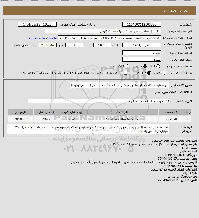 شرح کلی نیاز: تهیه طرح جنگلداری اجتماعی در شهرستان نورآباد ممسنی ( دشمن زیاری)