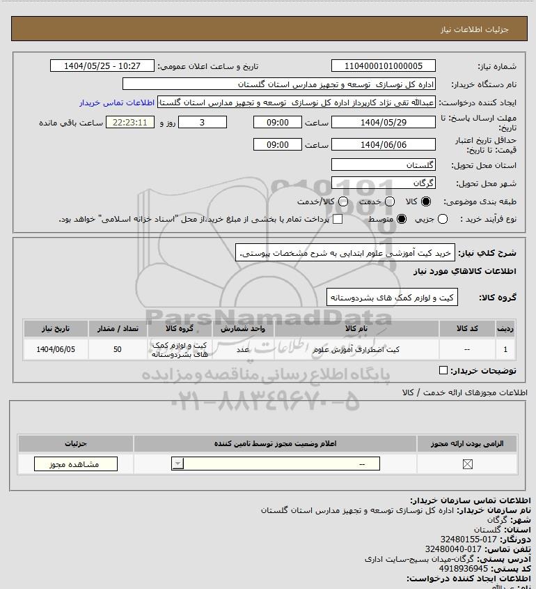 شرح کلی نیاز: خرید کیت آموزشی علوم ابتدایی به شرح مشخصات پیوستی.