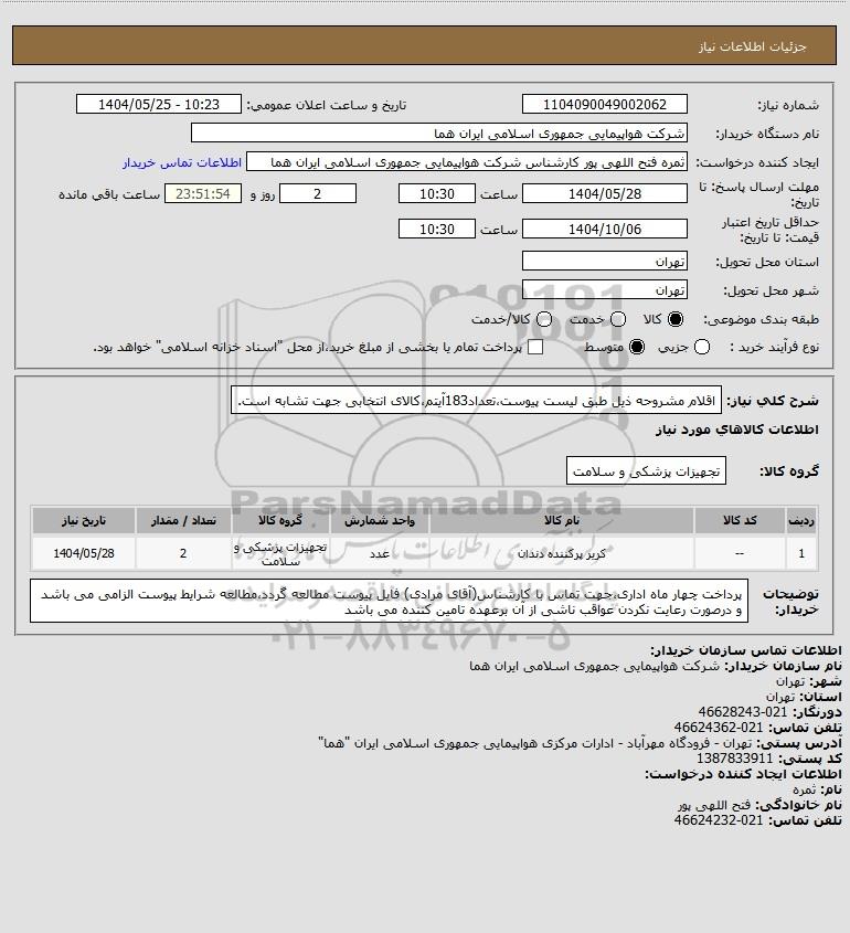 نام دستگاه خریدار:شرکت هواپیمایی جمهوری اسلامی ایران هما