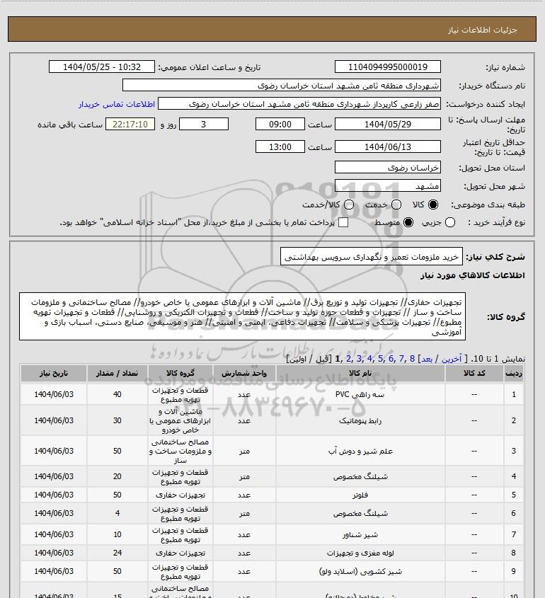 شرح کلی نیاز: خرید ملزومات تعمیر و نگهداری سرویس بهداشتی