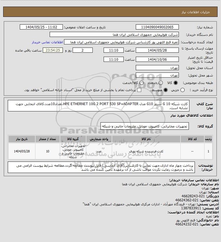 شرح کلی نیاز: کارت شبکه 10 G سرور G10 مدل HPE ETHERNET 10G 2 PORT 530 SP+ADAPTER،تعداد10عدد،کالای انتخابی جهت تشابه است.