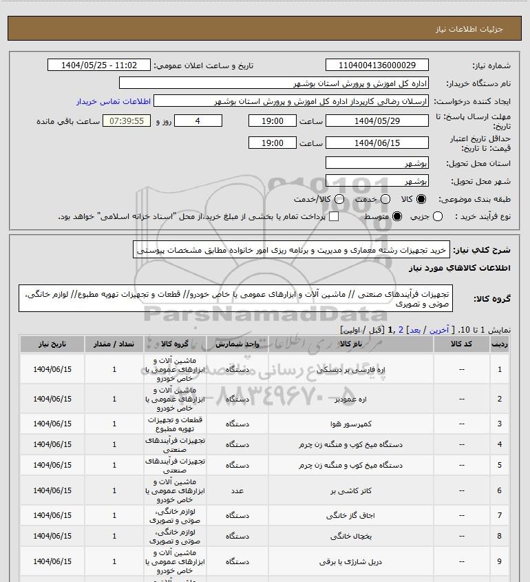 شرح کلی نیاز: خرید تجهیزات رشته معماری و مدیریت و برنامه ریزی امور خانواده مطابق مشخصات پیوستی