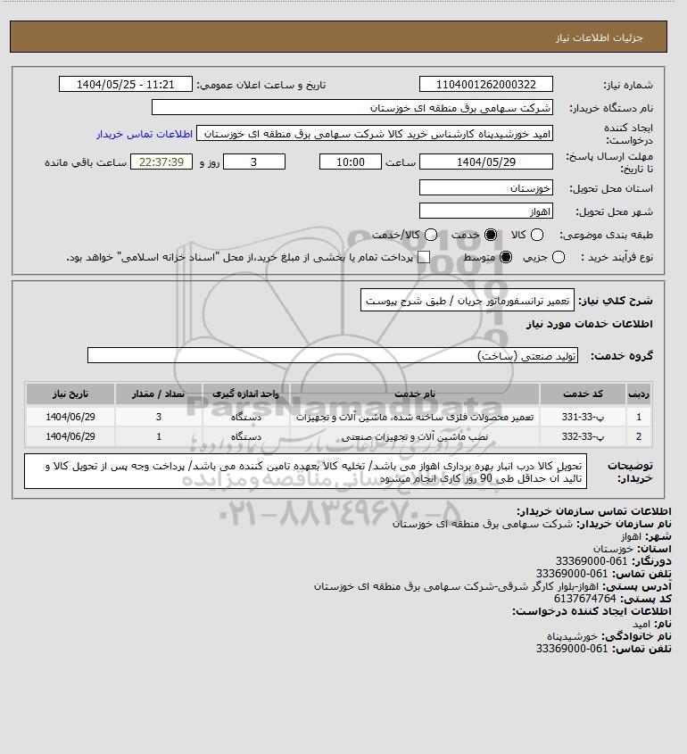 شرح کلی نیاز: تعمیر ترانسفورماتور جریان / طبق شرح پیوست
