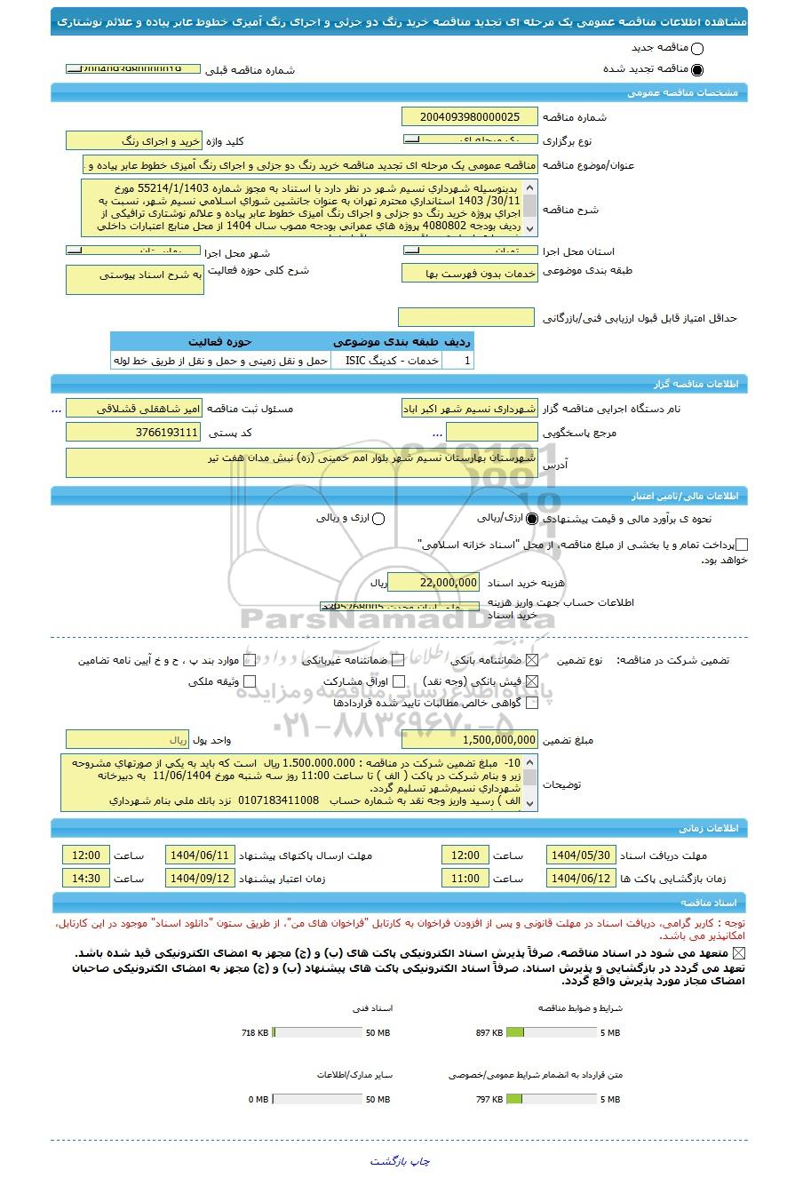 | شرح مناقصه | بدينوسيله شهرداري نسيم شهر در نظر دارد با استناد به مجوز شماره 55214/1/1403 مورخ 30/11/ 1403 استانداري محترم تهران به عنوان جانشين شوراي اسلامي نسيم ‌شهر، نسبت به اجراي پروژه خريد رنگ دو جزئی و اجرای رنگ آمیزی خطوط عابر پیاده و علائم نوشتاری ترافیکی از رديف بودجه 4080802 پروژه هاي عمراني بودجه مصوب سال 1404 از محل منابع اعتبارات داخلي شهرداري از طريق مناقصه عمومي اقدام نمايد. | ||||||||