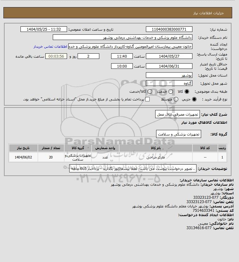 | 1 | -- | مارکر جراحی | عدد | تجهیزات پزشکی و سلامت | 20 | 1404/06/02 |
