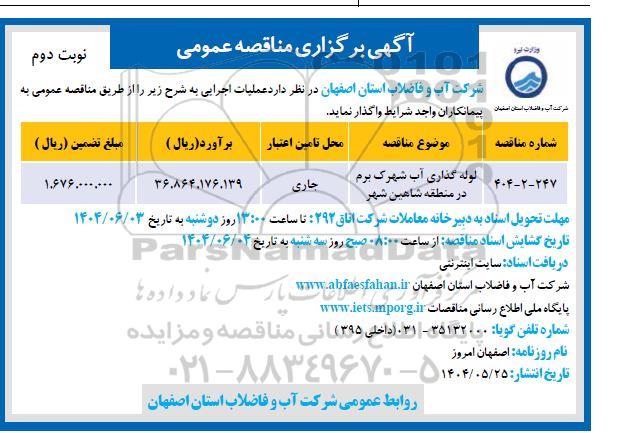 شرکت آب و فاضلاب استان اصفهان در نظر دارد عملیات اجرایی به شرح زیر را از طریق مناقصه عمومی به پیمانکاران واجد شرایط واگذار نماید.