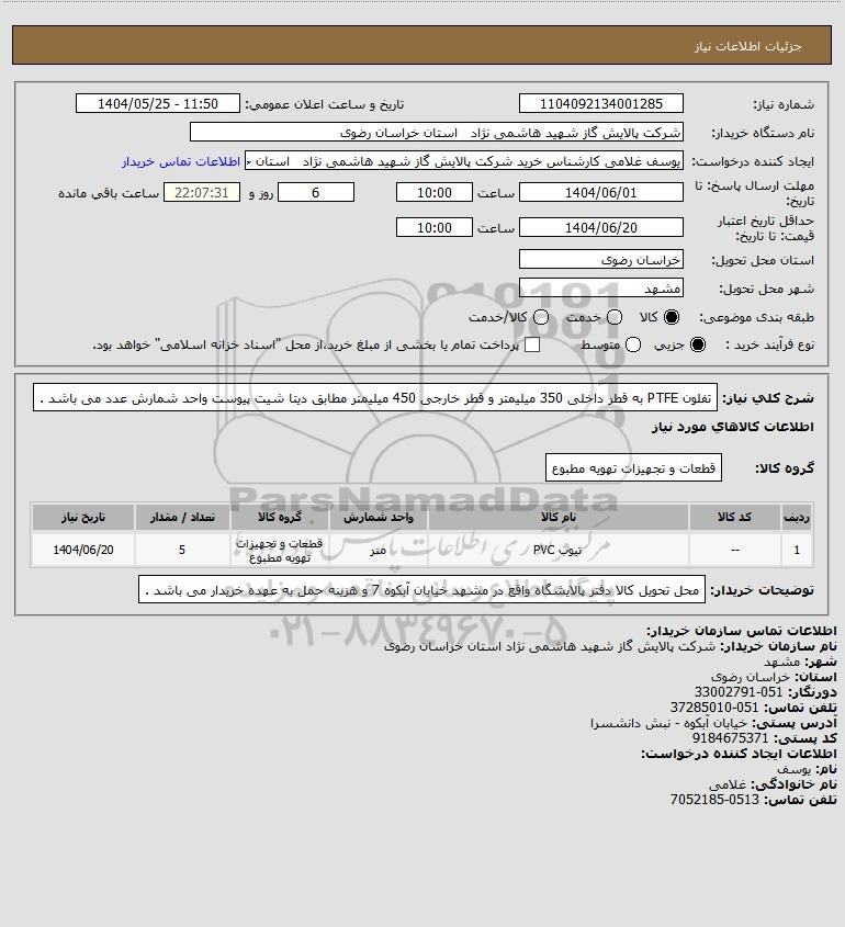 نام دستگاه خریدار:شرکت پالایش گاز شهید هاشمی نژاد استان خراسان رضوی