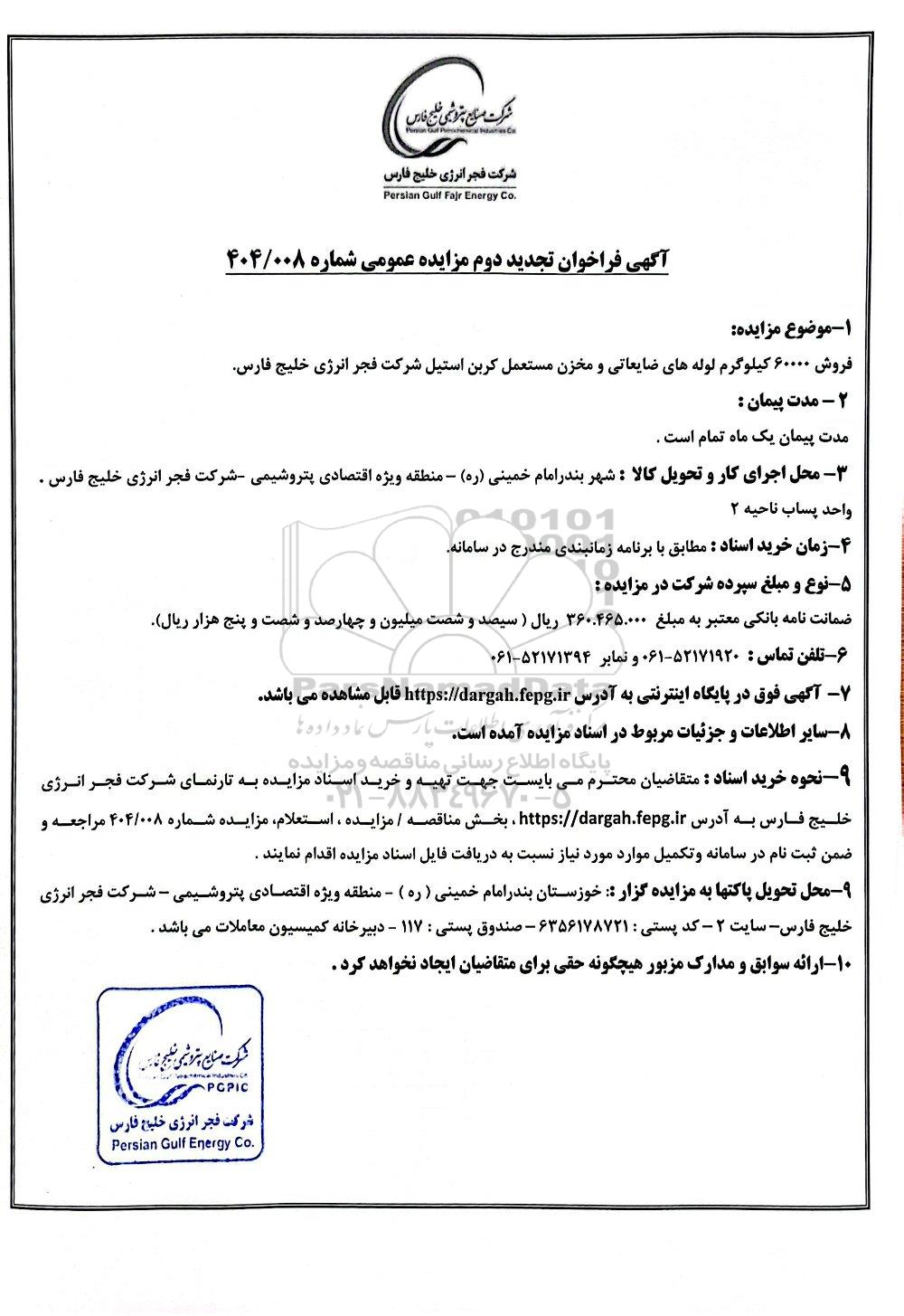 فروش 60000 کیلوگرم لوله های ضایعاتی و مخزن مستعمل کربن استیل شرکت فجر انرژی خلیج فارس