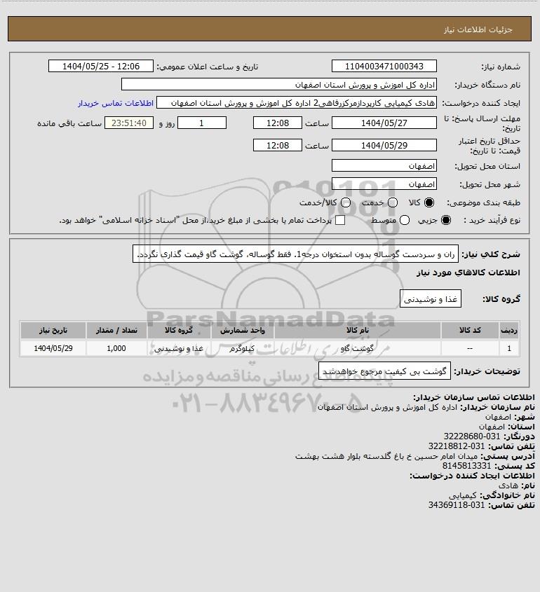 شرح کلی نیاز: ران و سردست گوساله بدون استخوان درجه1. فقط گوساله، گوشت گاو قیمت گذاری نگردد.