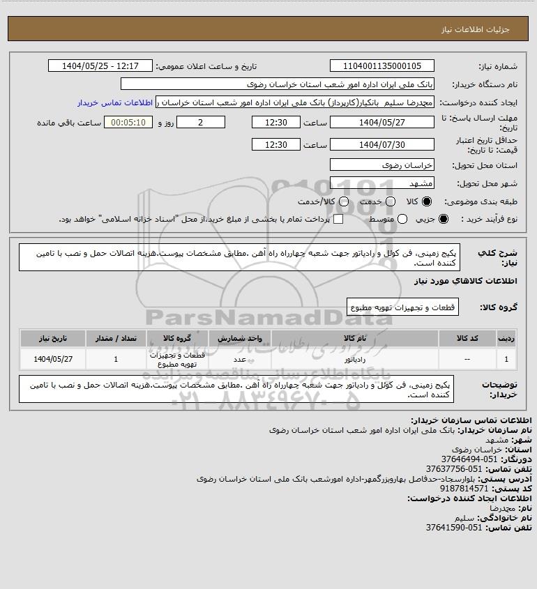 شرح کلی نیاز: پکیج زمینی، فن کوئل و رادیاتور جهت شعبه چهارراه راه آهن .مطابق مشخصات پیوست.هزینه اتصالات حمل و نصب با تامین کننده است.