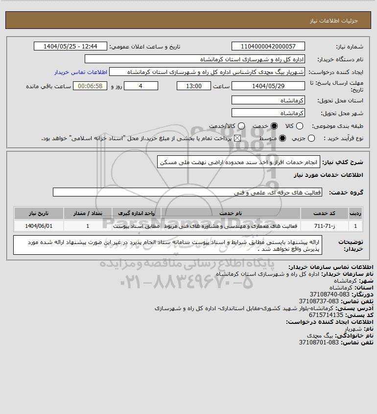 شرح کلی نیاز: انجام خدمات افراز و اخذ سند محدوده اراضی نهضت ملی مسکن