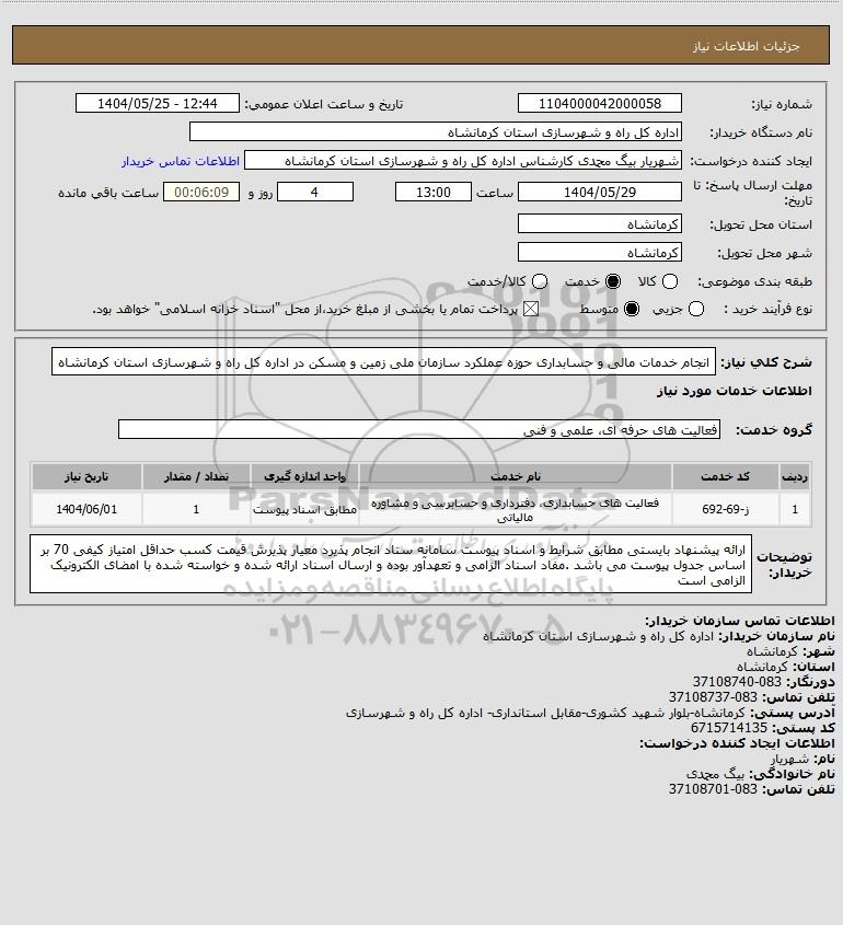 شرح کلی نیاز: انجام خدمات مالی و حسابداری حوزه عملکرد سازمان ملی زمین و مسکن در اداره کل راه و شهرسازی استان کرمانشاه