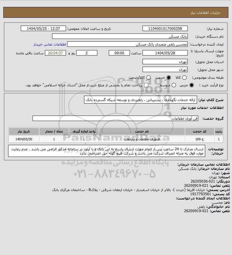 شرح کلی نیاز: ارائه خدمات نگهداری ، پشتیبانی ، راهبردی و توسعه شبکه گسترده بانک