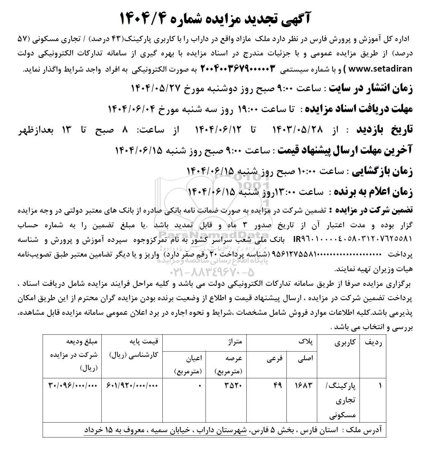 اداره کل آموزش و پرورش فارس در نظر دارد ملک مازاد واقع در داراب را با کاربری پارکینک (43 درصد) / تجاری مسکونی (57 درصد) از طریق مزایده عمومی و با جزئیات مندرج در اسناد مزایده با بهره گیری از سامانه تدارکات الکترونیکی دولت و با شماره سیستمی 2004003679000003 به صورت الکترونیکی به افراد واجد شرایط واگذار نماید.