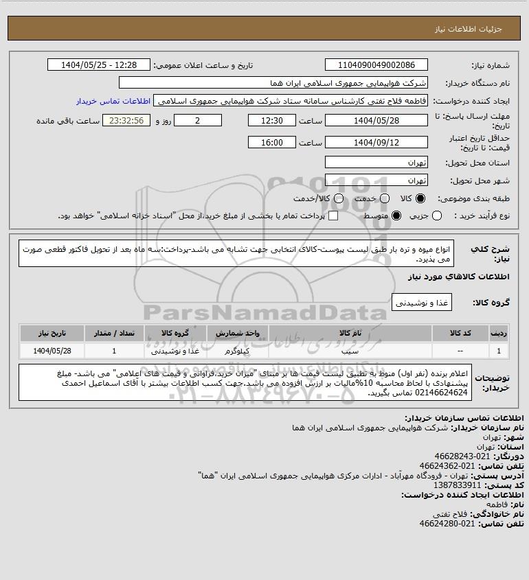 شرح کلی نیاز: انواع میوه و تره بار طبق لیست پیوست-کالای انتخابی جهت تشابه می باشد-پرداخت:سه ماه بعد از تحویل فاکتور قطعی صورت می پذیرد.