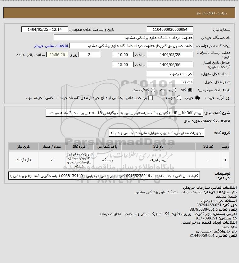 | 1 | -- | پرینتر لیزری | دستگاه | تجهیزات مخابراتی، کامپیوتر، موبایل، ملزومات جانبی و شبکه | 2 | 1404/06/06 |