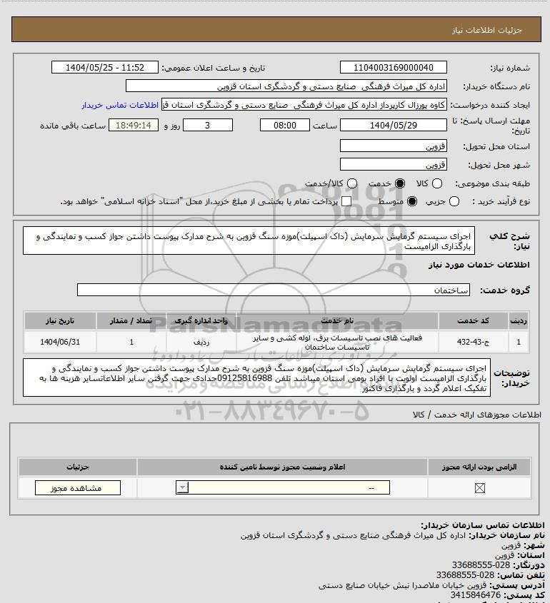 شرح کلی نیاز: اجرای سیستم گرمایش سرمایش (داک اسپیلت)موزه سنگ قزوین به شرح مدارک پیوست داشتن جواز کسب و نمایندگی و بارگذاری الزامیست