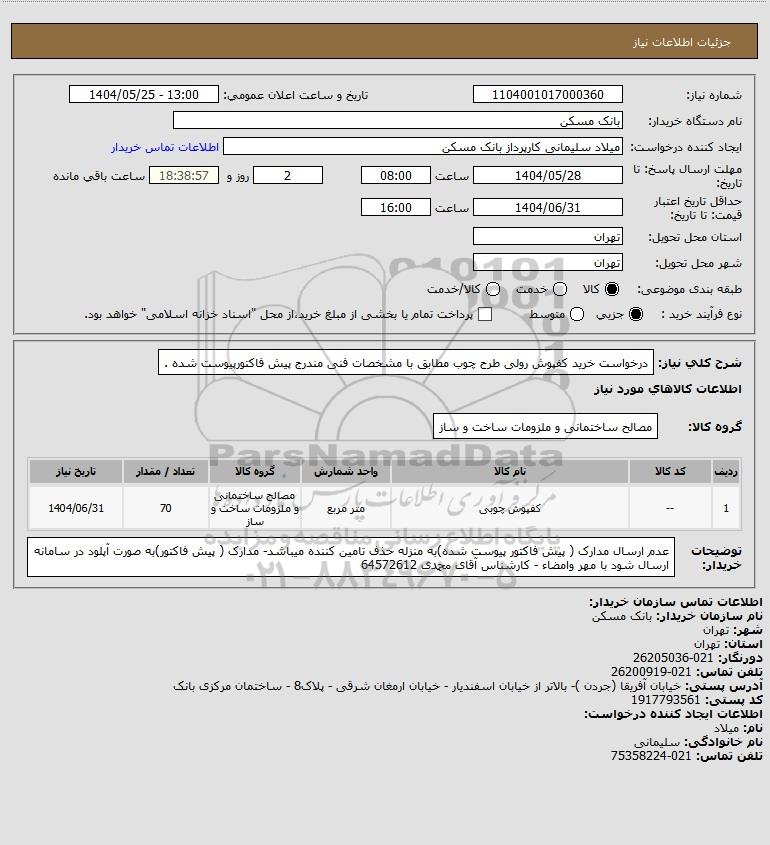 | 1 | -- | کفپوش چوبی | متر مربع | مصالح ساختمانی و ملزومات ساخت و ساز | 70 | 1404/06/31 |