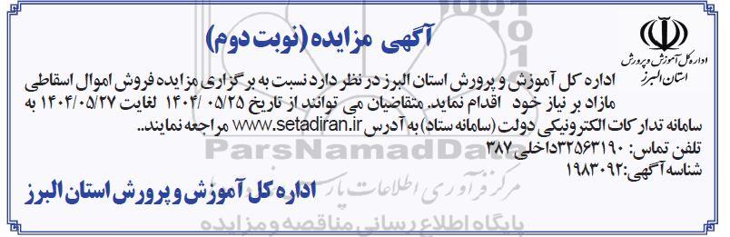 اداره کل آموزش و پرورش استان البرز در نظر دارد نسبت به برگزاری مزایده فروش اموال اسقاطی مازاد برنیاز خود اقدام نماید. متقاضیان می توانند از تاریخ 1404.5.25 لغایت 1404.5.27 به سامانه تدارکات الکترونیک دولت (سامانه ستاد) مراجعه نمایند.