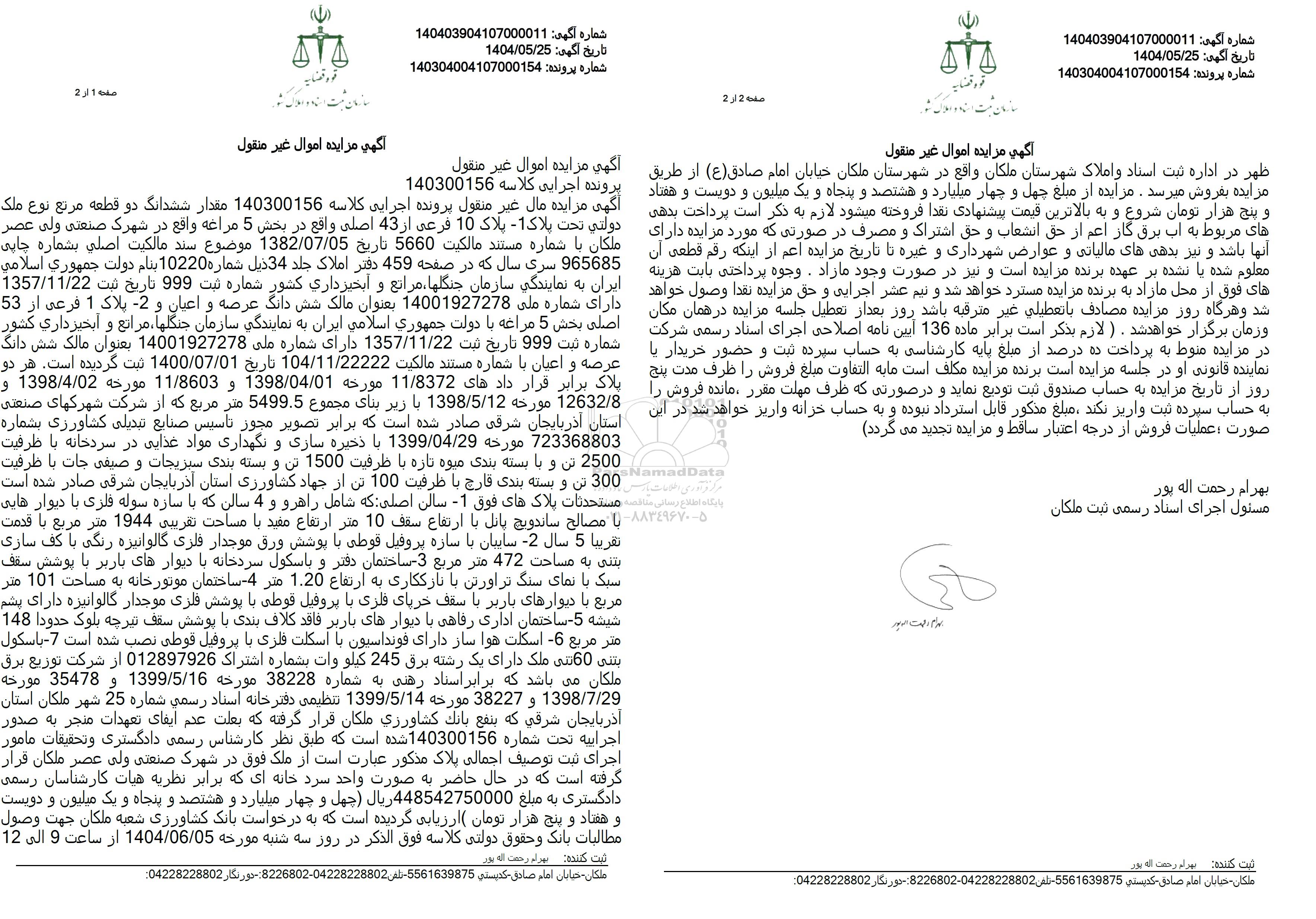 اگهی مزایده اموال غیرمنقول