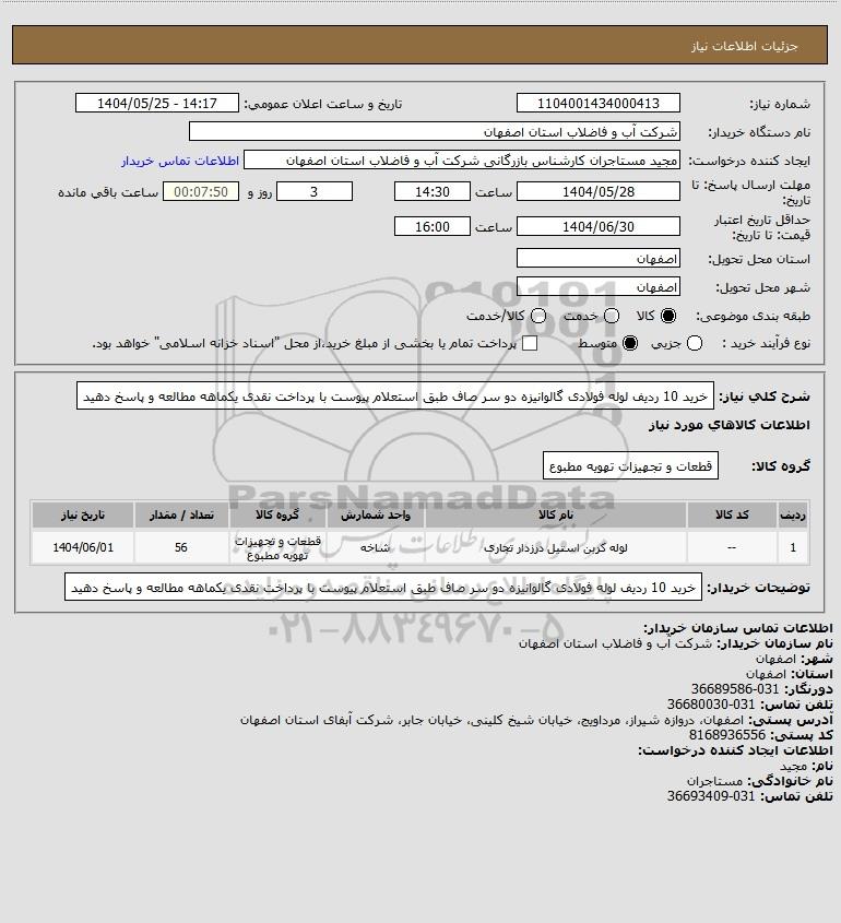 شرح کلی نیاز: خرید 10 ردیف لوله فولادی گالوانیزه دو سر صاف طبق استعلام پیوست با پرداخت نقدی یکماهه مطالعه و پاسخ دهید