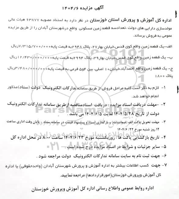 مزایده فروش تعداد سه قطعه زمین مسکونی واقع در شهرستان آبادان