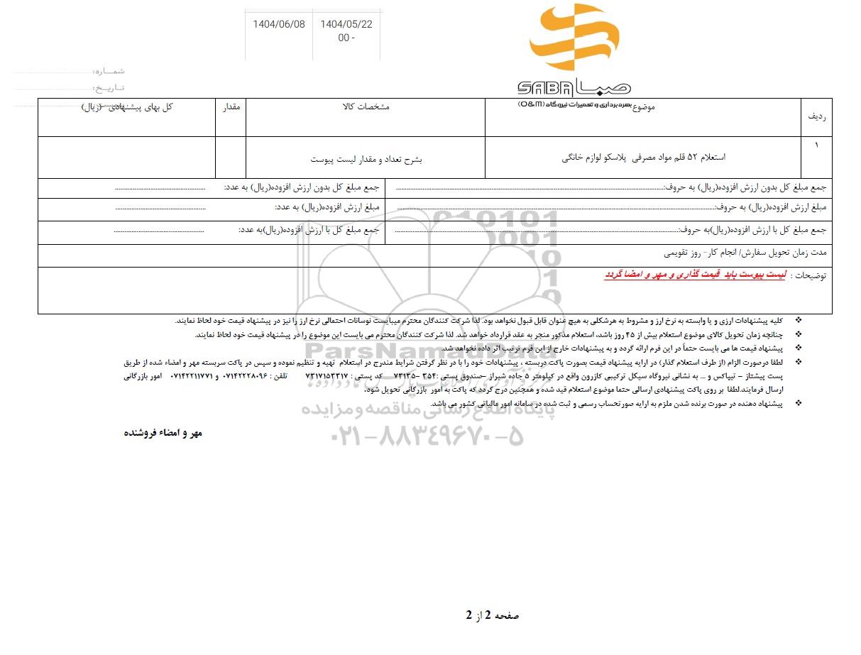 1 استعلام 52 قلم مواد مصرفی پلاسکو لوازم خانگی بشرح تعداد و مقدار لیست پیوست