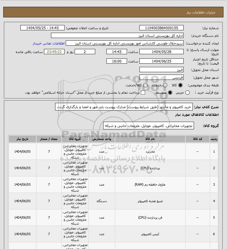 شرح کلی نیاز: خرید کامپیوتر و مانیتور (طبق شرایط پیوست) مدارک پیوست باید مهر و امضا و بارگذاری گردد.