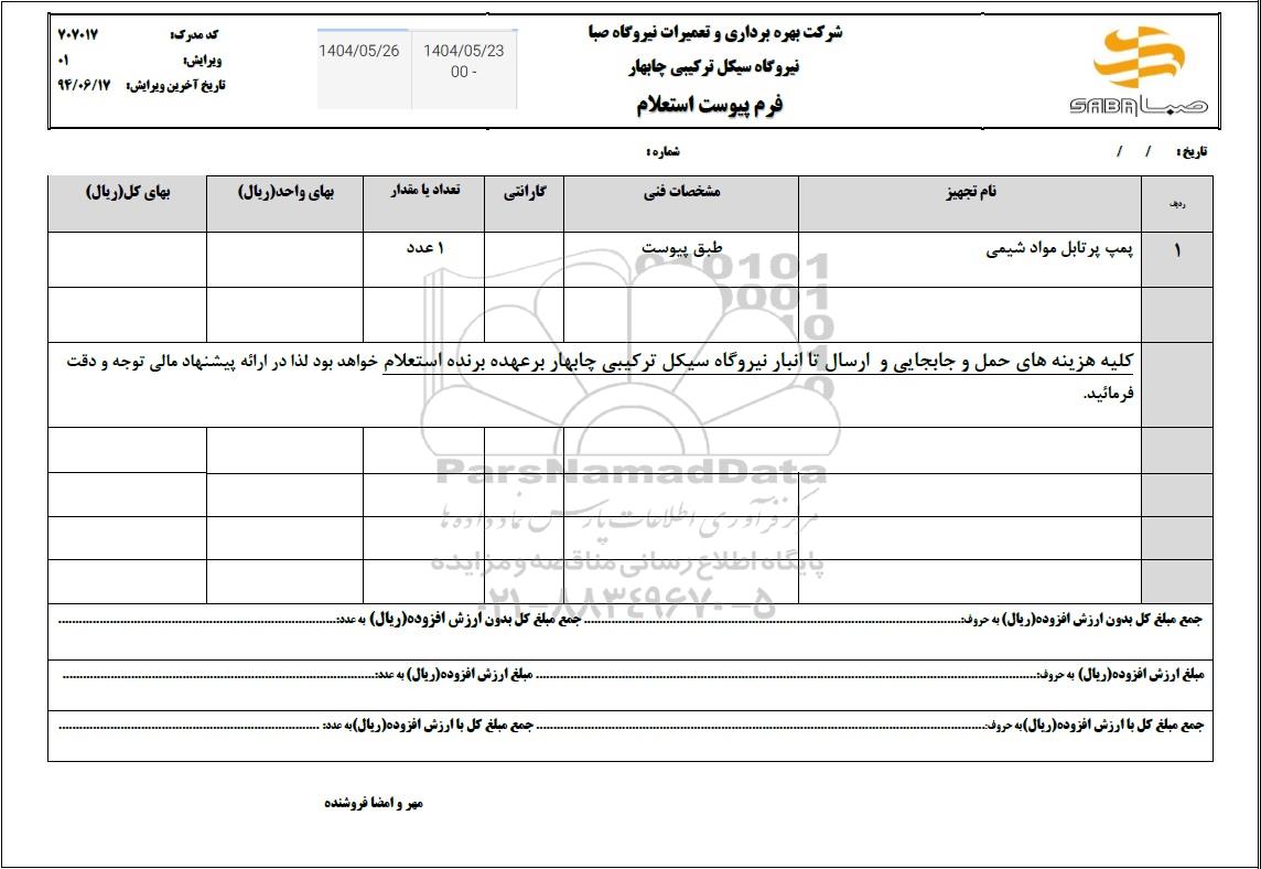 استعلام بها و موضوع استعلام استعلام پمپ پرتابل مواد شیمی به اطلاع کلیه شرکتها و افراد متخصص واجد شرایط میرساند، آگهی گذار در نظر دارد از طریق استعلام بها، نسبت به انتخاب و دریافت پیشنهادات اقدام نماید. این استعلام با کد آگهی ثبت شده در سامانه خبرگزاری پارس نماد : 9412925 منتشر شده است. مشخصات استعلام : تاریخ شروع استعلام: 1404/05/25 آخرین مهلت ارسال پیشنهاد قیمت : 1404/05/26 و محل اجرای پروژه : استان سیستان و بلوچستان میباشد. استعلام قیمت مورد درخواست : استعلام پمپ پرتابل مواد شیمی با دستهبندیهای تخصصی و گروه های مرتبط : الکتروموتور و پمپ های شناور, نیروگاه, تجهیزات برق و الکترونیک, استعلام اطلاع رسانی میگردد. شرایط شرکت در استعلام آنلاین : ابتدا ثبت نام در سامانه استعلام پارس نماد و تکمیل مدارک موردنیاز و بارگذاری در سامانه رعایت تمامی ضوابط و الزامات مندرج در اسناد استعلام است.
