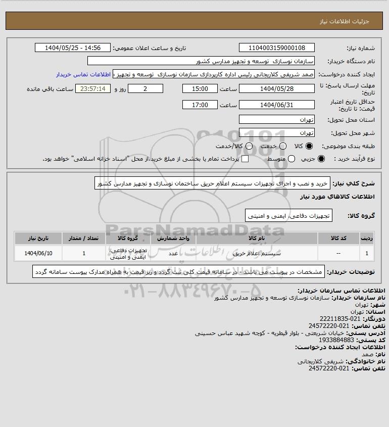 شرح کلی نیاز: خرید و نصب و اجرای تجهیزات سیستم اعلام حریق ساختمان نوسازی و تجهیز مدارس کشور