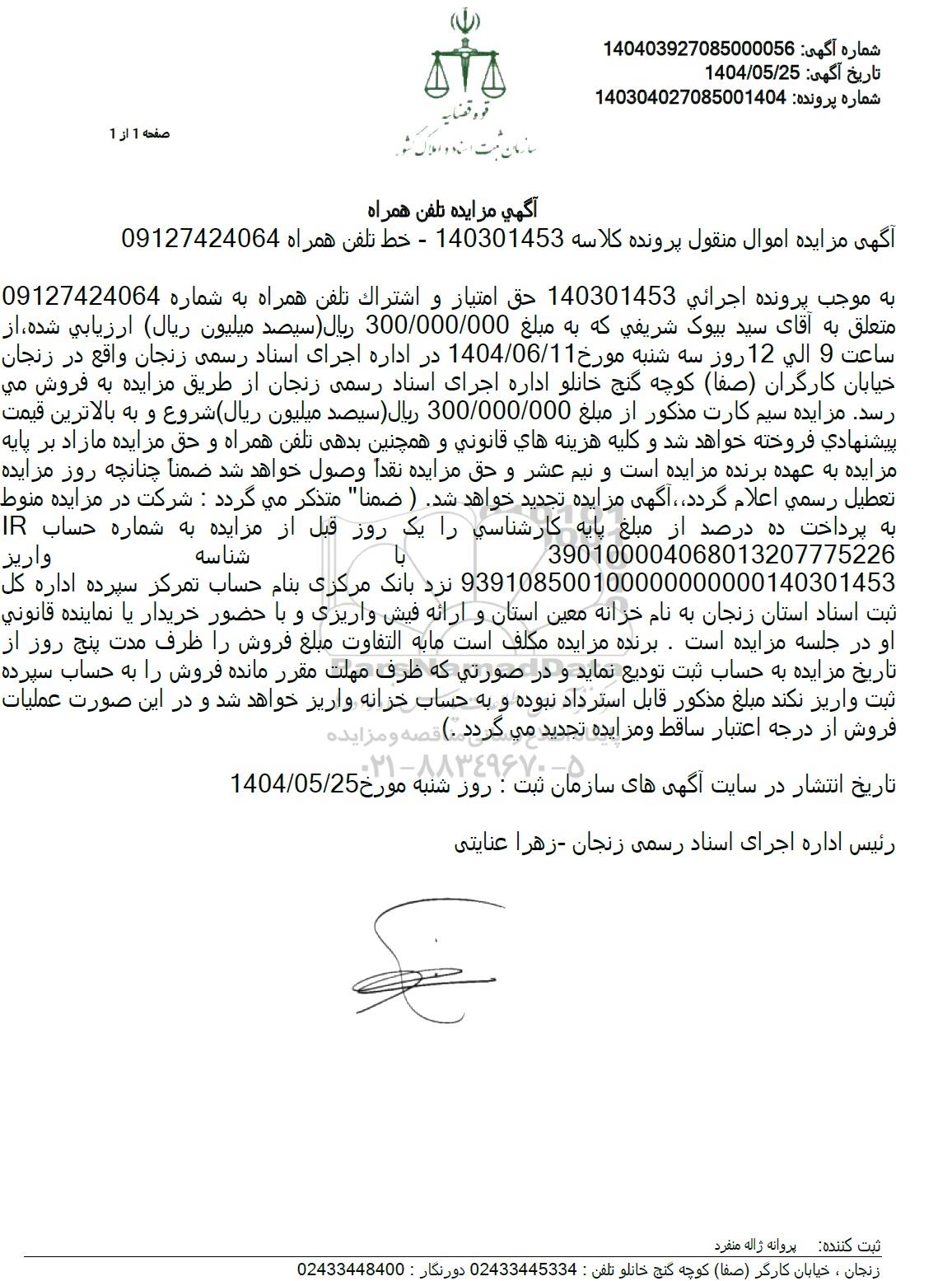 مزایده حق امتیاز و اشتراک تلفن همراه به شماره 09127424064